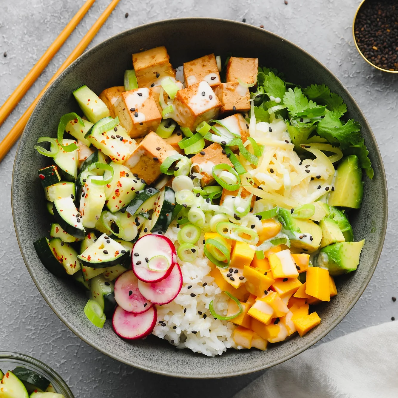 ingredients: rice, mini cucumber, carrot, edamame, watermelon, tofu, sesame seeds